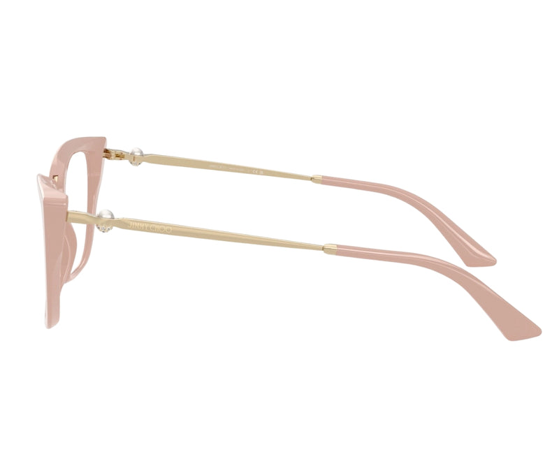 Feminine and refined, the Jimmy Choo 3034HB 5014 optical frames feature a stylish cat-eye silhouette in a delicate light pink finish. Crafted from a premium combination of materials, these frames offer both elegance and comfort for all-day wear. The clear lenses are ready for prescription customization, making them a perfect blend of fashion and function. With soft curves and subtle detailing, this design captures Jimmy Choo's signature sophistication. Ideal for those who love a classic look with a graceful, modern touch, these frames add a hint of glamour to any outfit—whether at the office or out and about.