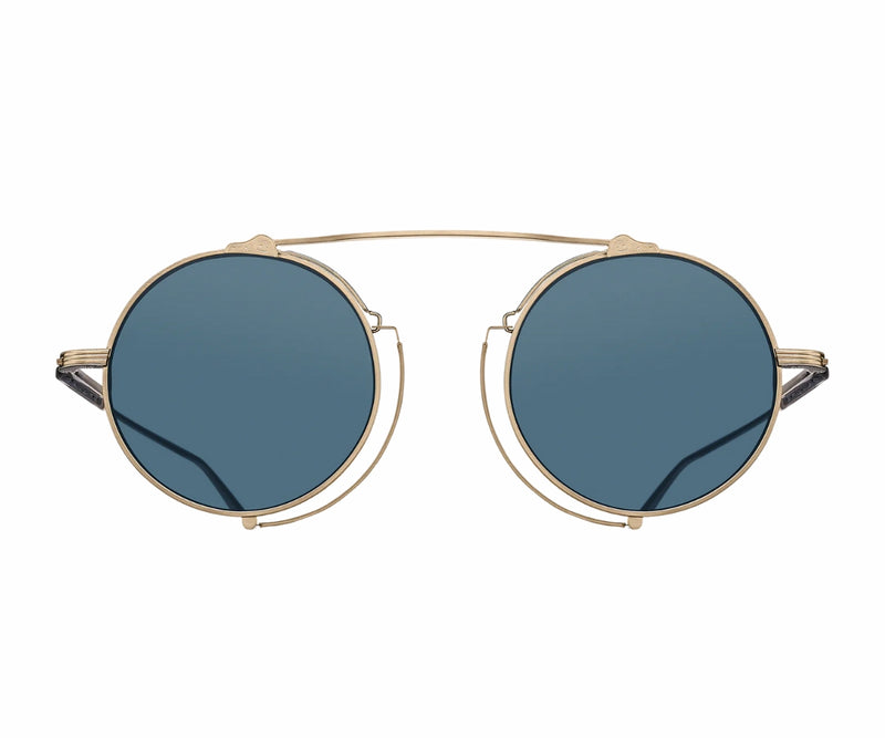 The MATSUDA M3154 Brushed Gold sunglasses are a striking blend of classic form and innovative design. Featuring a refined round shape, the frame is crafted from lightweight titanium in an elegant Brushed Gold finish that radiates timeless sophistication. The deep blue solid lenses offer strong UV protection while creating a rich contrast against the metallic tone of the frame. With intricate detailing and precision engineering, this model reflects MATSUDA’s signature approach to luxury craftsmanship. Perfect for those who appreciate heritage-inspired aesthetics with a modern edge, the M3154 makes a bold yet sophisticated statement in everyday wear.